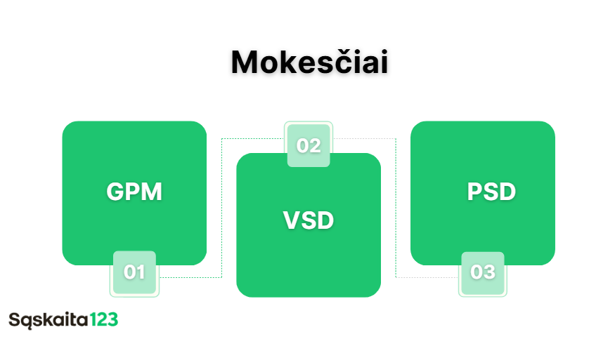 - Mokesčiai priklauso nuo pajamų – jei nieko neuždirbate, nemokate GPM ir VSD (tik PSD, jei neturite draudimo kitur).
